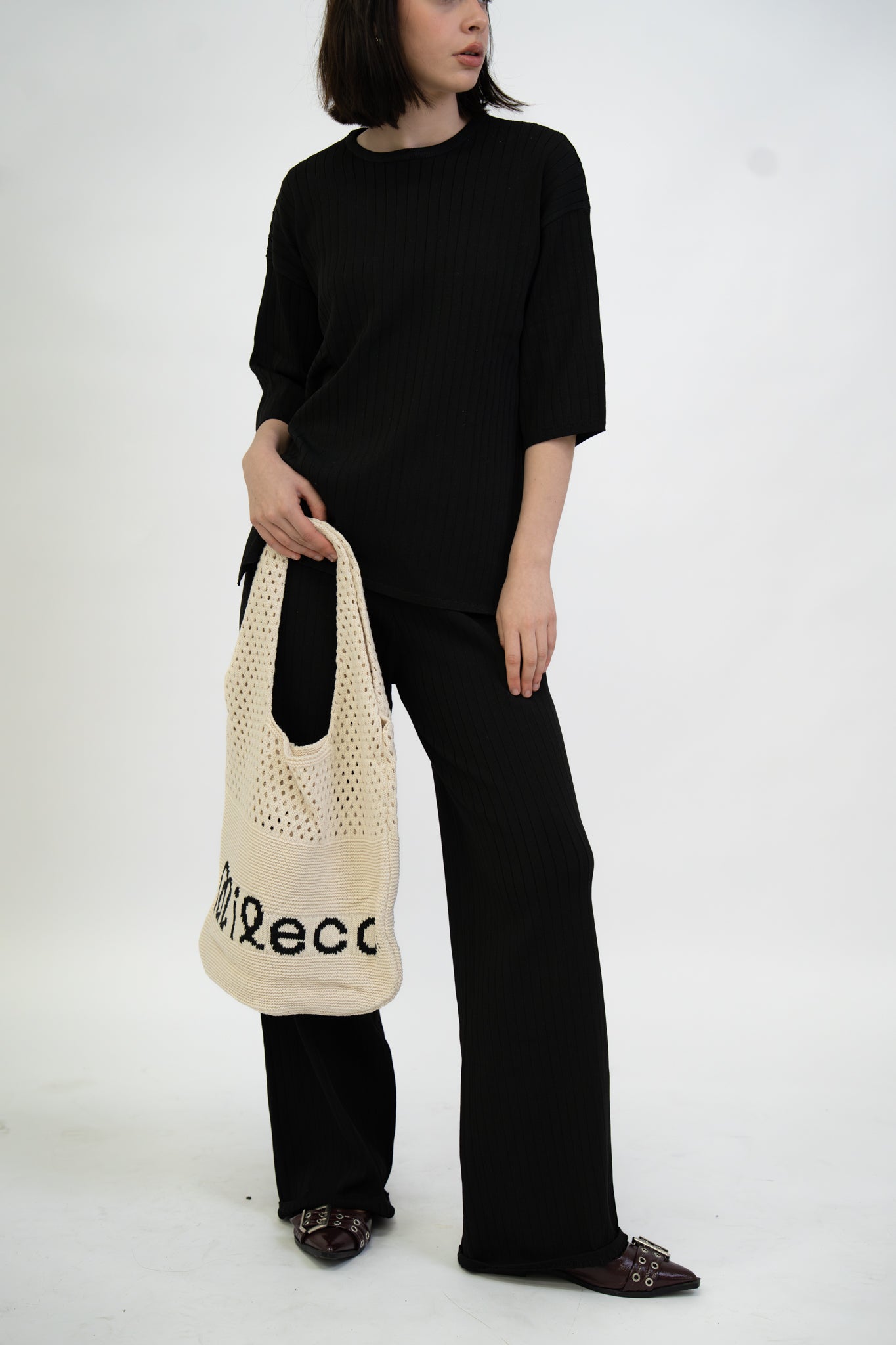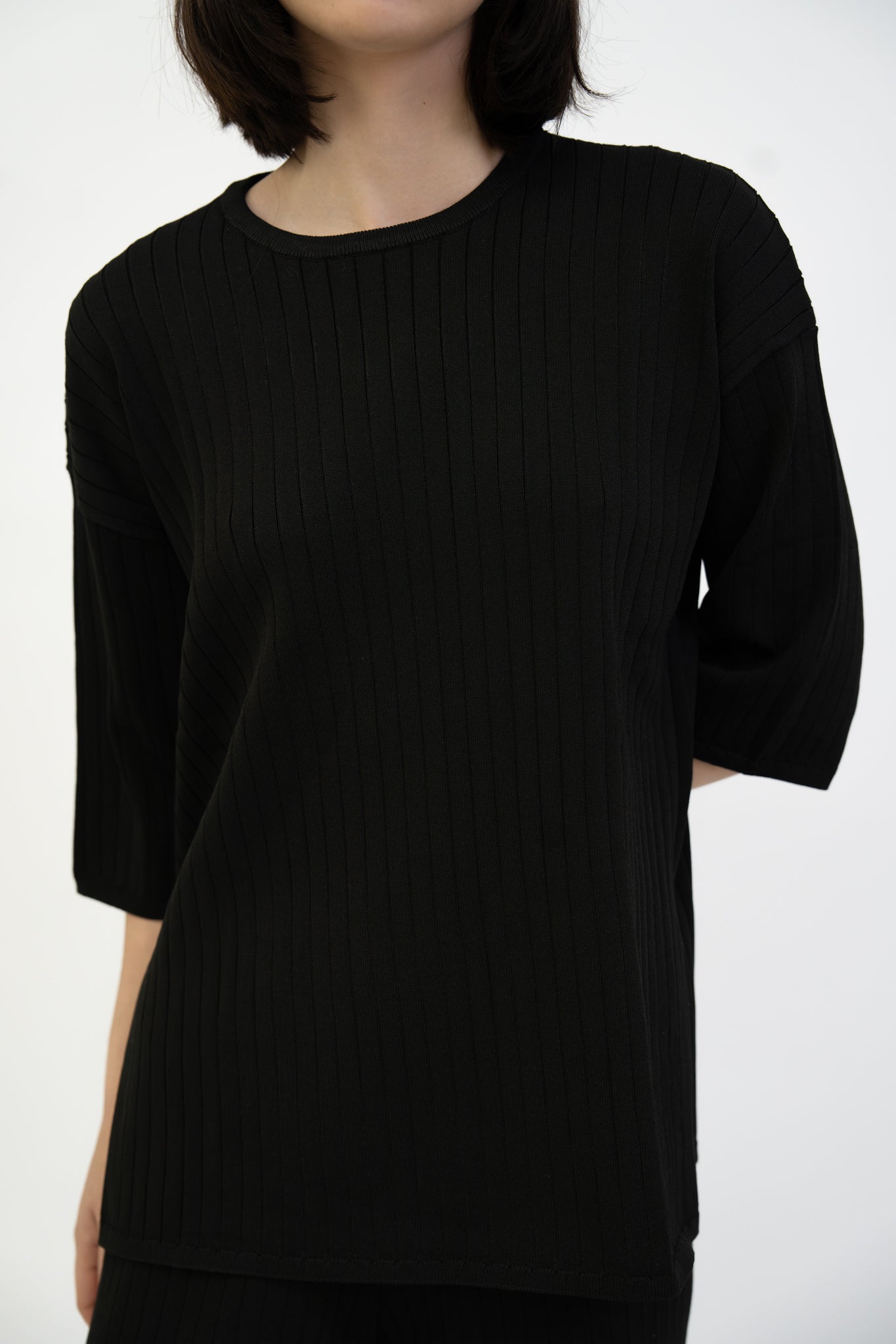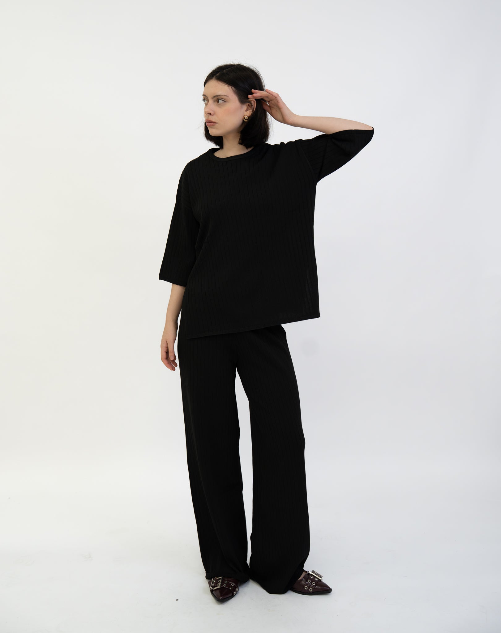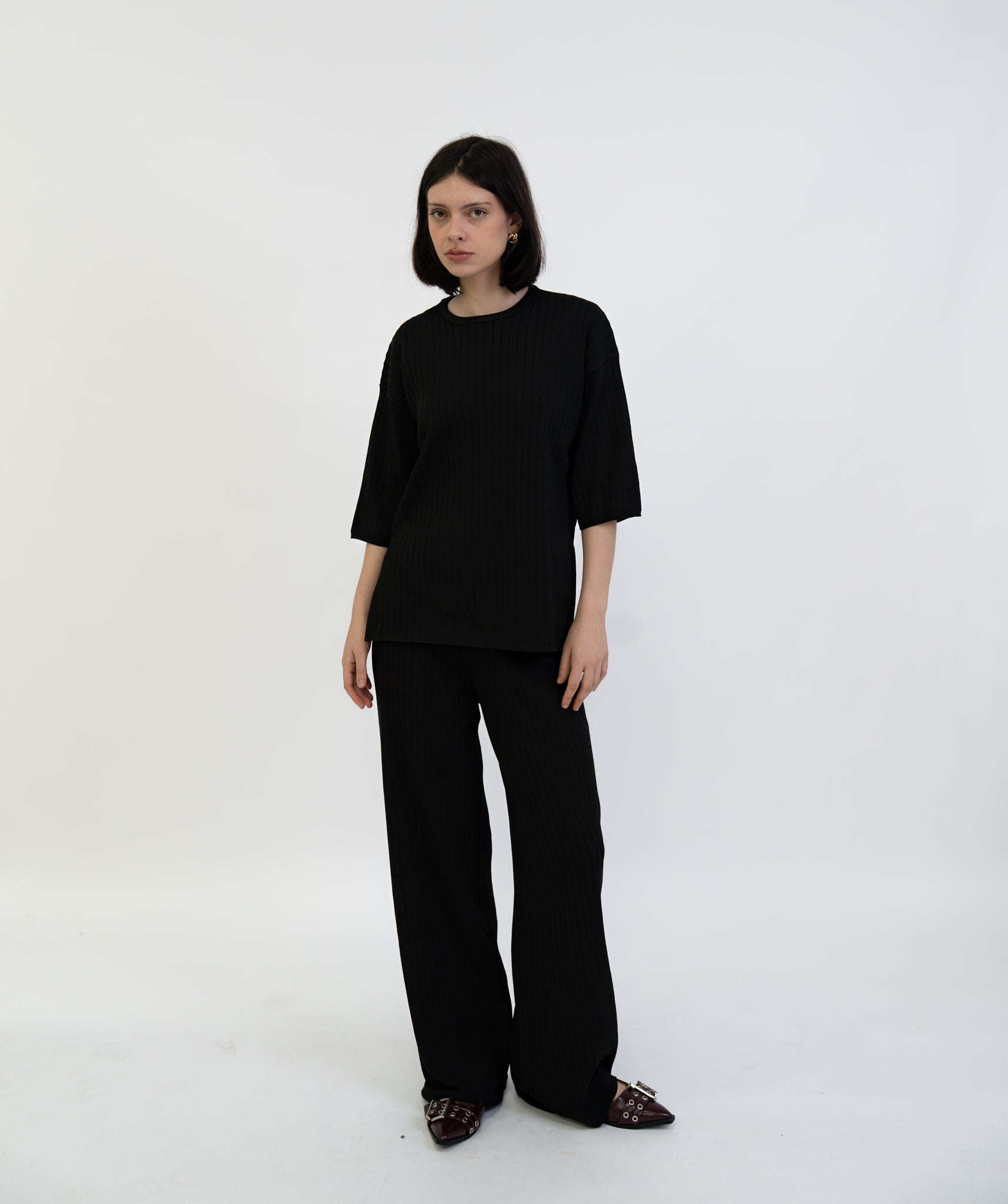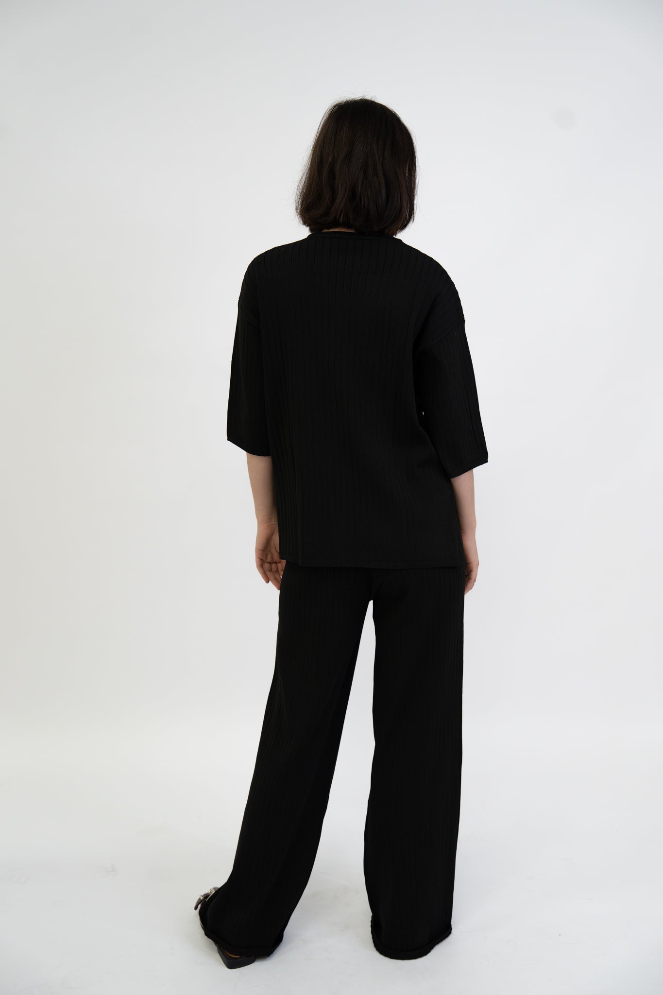 Sleek and minimal, this black set features a relaxed top and wide-leg trousers. Easy elegance for work or play.